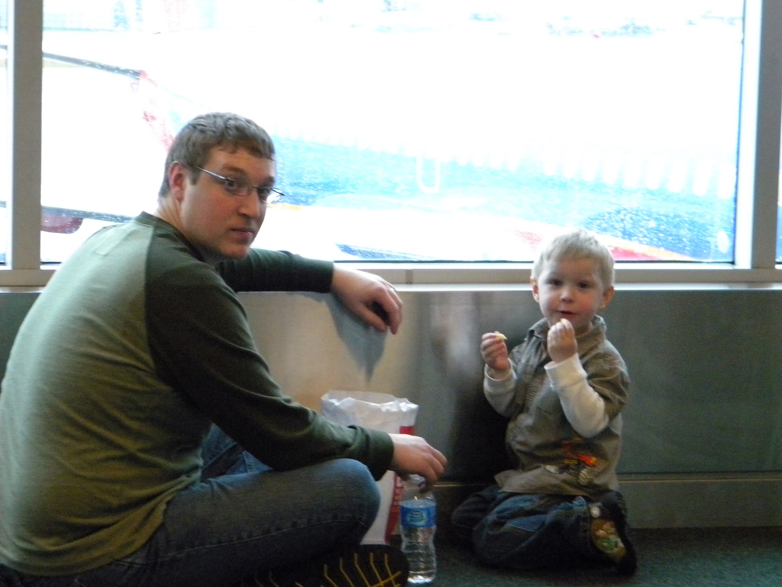 Our flight was delayed for about a half an hour so we were able to find his backpack, and get situated for the flight. My grandma stayed with us for a while and then before crying too much, said goodbye and left.